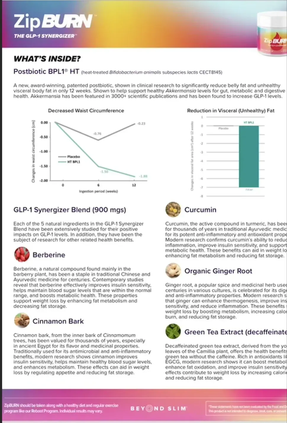 ZipBurn was designed to support healthy GLP-1 production, target stubborn abdominal fat, and help fight unhealthy visceral fat.